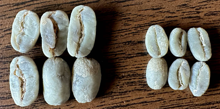 Tady je rozdíl ve velikosti zrn. Vpravo běžné kávové zrno.